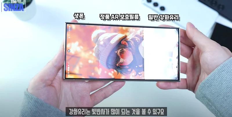 국내 유투버 중에 SINZA 채널에 이를 비교한 영상이 올라와 있는데 이 영상을 보면 빛반사와 관련해서 코닝 고릴라 아머의 성능이 얼마나 좋은지 바로 확인할 수 있었습니다.