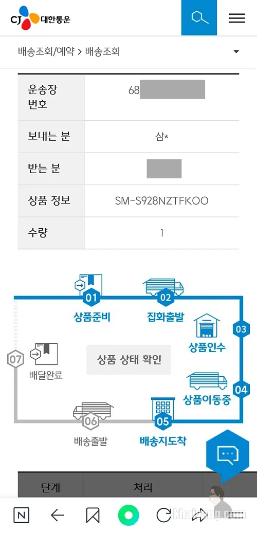 여기서는 운송장 번호만 확인할 수 있고 현재 나의 갤럭시S24 시리즈가 어디에 있는지는 알 수가 없습니다.