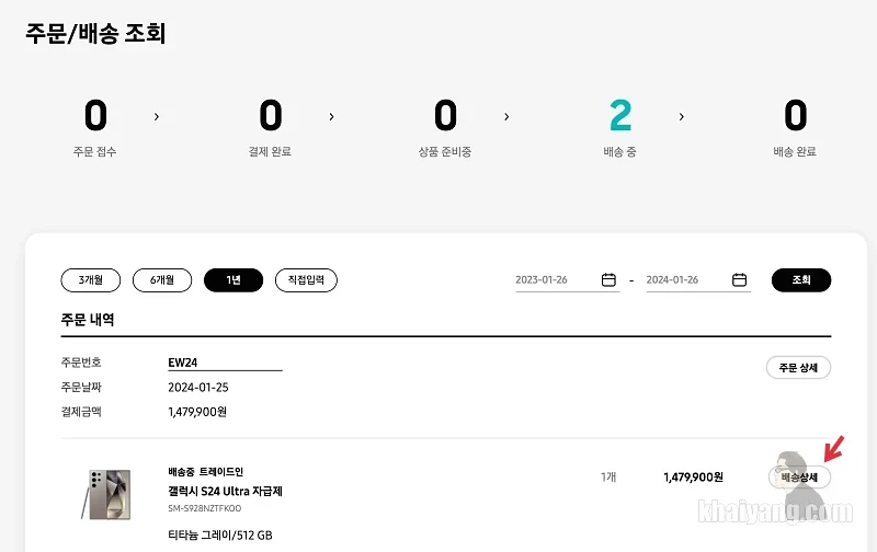 저는 이번에 갤럭시S24 울트라 2개를 구매해서 2개가 배송중이라고 뜹니다. 그래서 배송상태가 어떤지 확인하기 위해서 화살표가 가리키는 배송상세 메뉴를 눌러 봤습니다.