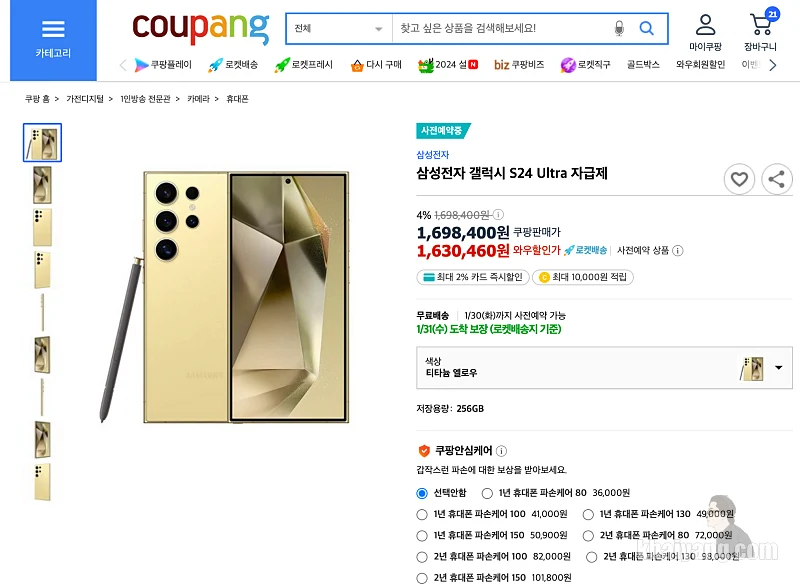 쿠팡에서는 갤럭시S24 울트라 256GB 티타늄 엘로우 가격을 와우 할인가로 1,630,460원에 판매가 되고 있습니다.
