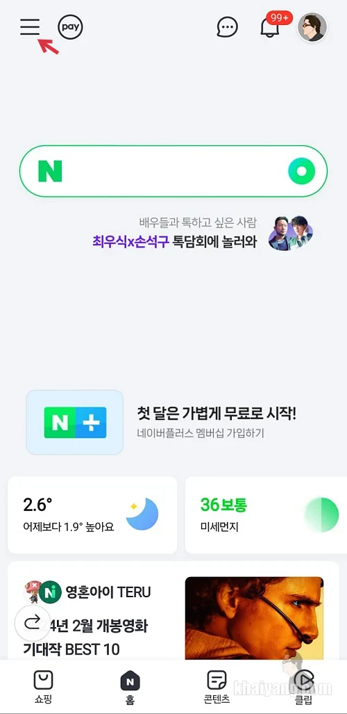 네이버 앱을 열고 상단 왼쪽에 있는 화살표 부분을 선택합니다.
