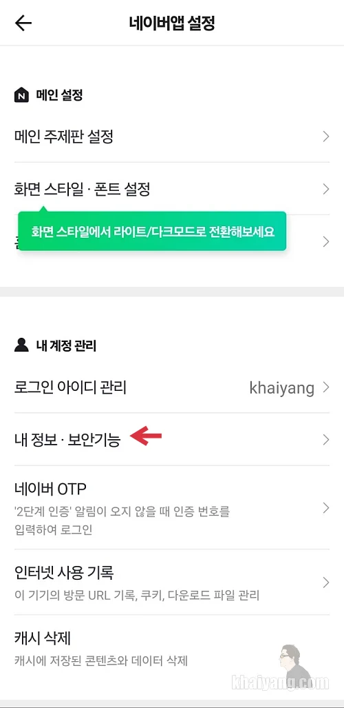 내 계정 관리 부분에서 화살표가 가리키는 내 정보.보안기능을 선택 합니다.