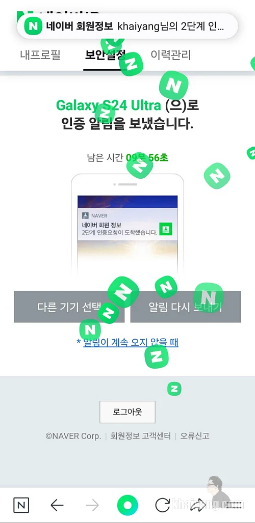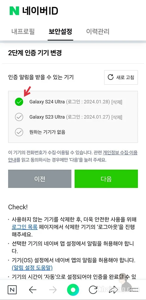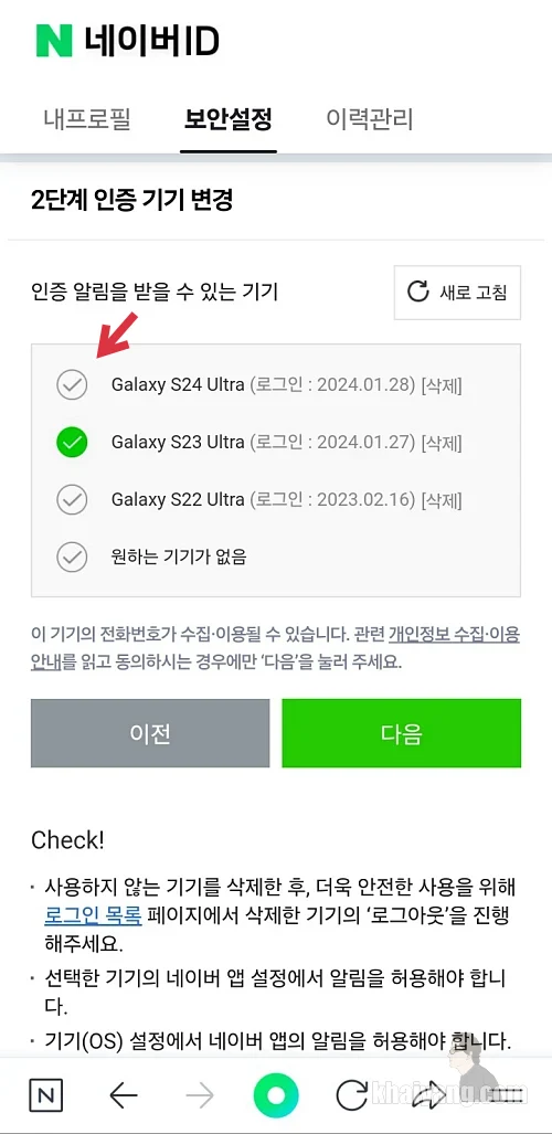 갤럭시S24 시리즈나 아이폰 등 새로운 기기로 변경을 할때는 네이버 로그인과 함께 2단계 기기 인증 변경을 꼭 진행하시기 바랍니다.