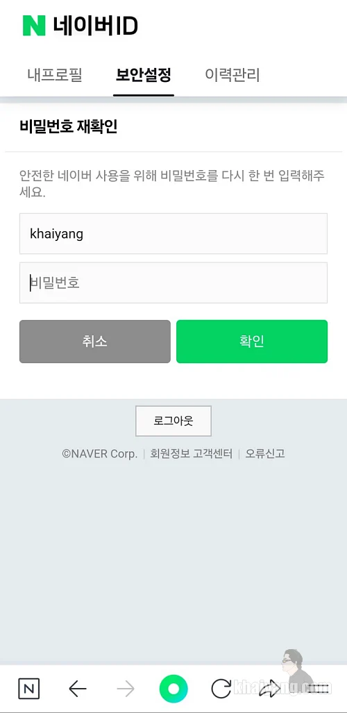 보안설정에서 네이버 비밀번호를 입력하고 확인 버튼을 누릅니다.