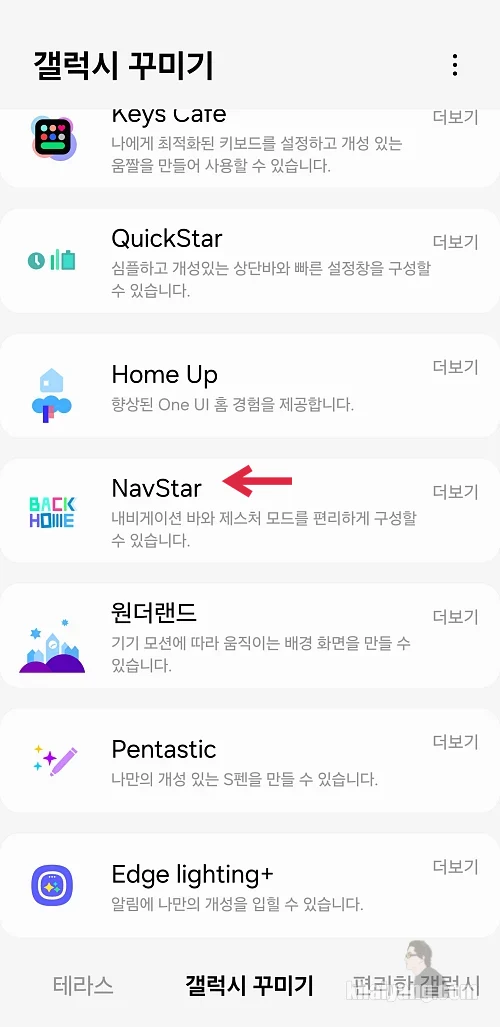 하단의 갤럭시 꾸미기에 들어 가셔서 NavStar 를 선택 합니다. 설치가 안되어 있다면 설치를 하신 후 선택하시기 바랍니다.