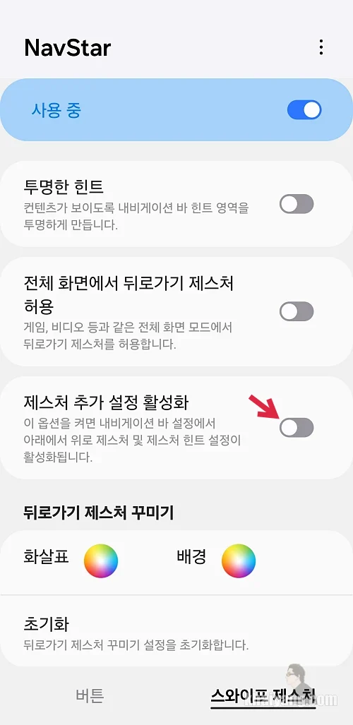 Navstar 사용중으로 선택한 상태에서 제스처 추가 설정 활성화 버튼을 활성화 시킵니다.