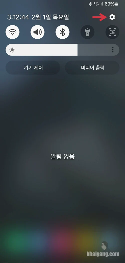 홈 화면에서 화면을 아래로 내려서 퀵패널 상단에 있는 톱니바퀴(설정) 부분을 선택 합니다.