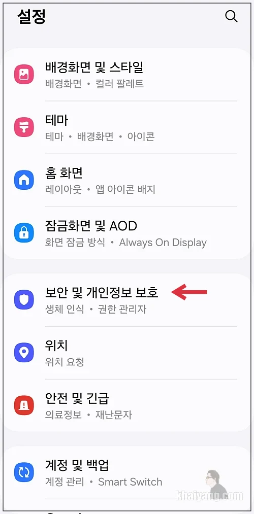 설정 중간 부분에서 보안 및 개인정보 보호 항목을 선택 합니다.