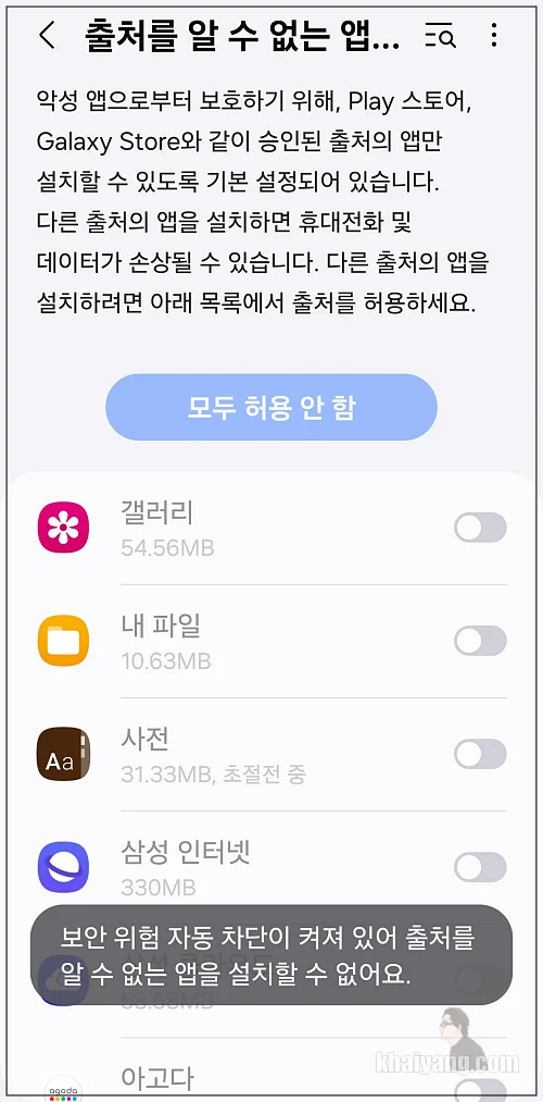 이전에도 출처를 알수 없는 앱을 설치하는 것을 막을 수 있었지만 간단한 설정을 통해서 쉽게 설치할 수 있었습니다.