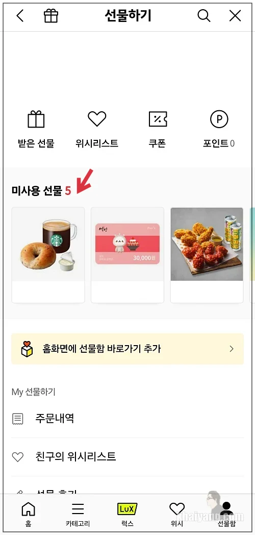 미사용 선물 부분을 터치 합니다.