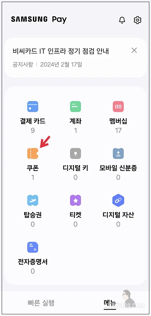 삼성페이 메뉴 항목을 보면 쿠폰 항목에 숫자가 추가된 것을 볼 수 있습니다.
