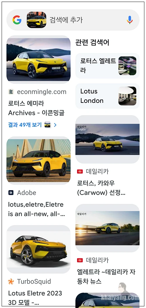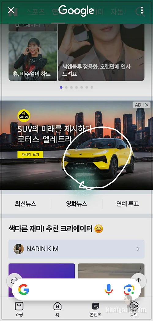 광고에 나와 있는 자동차를 보고 원을 그려봤더니 자동차 관련된 내용이 나옵니다. 만약 이미지를 보시다가 차 이름이 궁금하면 그냥 간단하게 원만 그려서 차 브랜드와 이름을 바로 확인할 수 있습니다.
