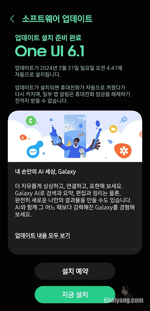 선택하고 나면 로딩 화면이 보이실텐데 조금 기다리면 원UI 6.1 업데이트가 진행된다는 내용을 볼 수 있는데 그 화면에서 지금 설치를 진행 합니다.