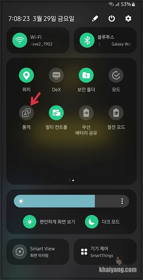 갤럭시 AI 번역에서 제가 가장 유용하게 사용하고 있는 대화 번역이 되는지 살펴 봤습니다. 상단 알림창을 내려서 확인해 보니 이전에 없었던 통역 아이콘이 생성된 걸 볼 수 있습니다.