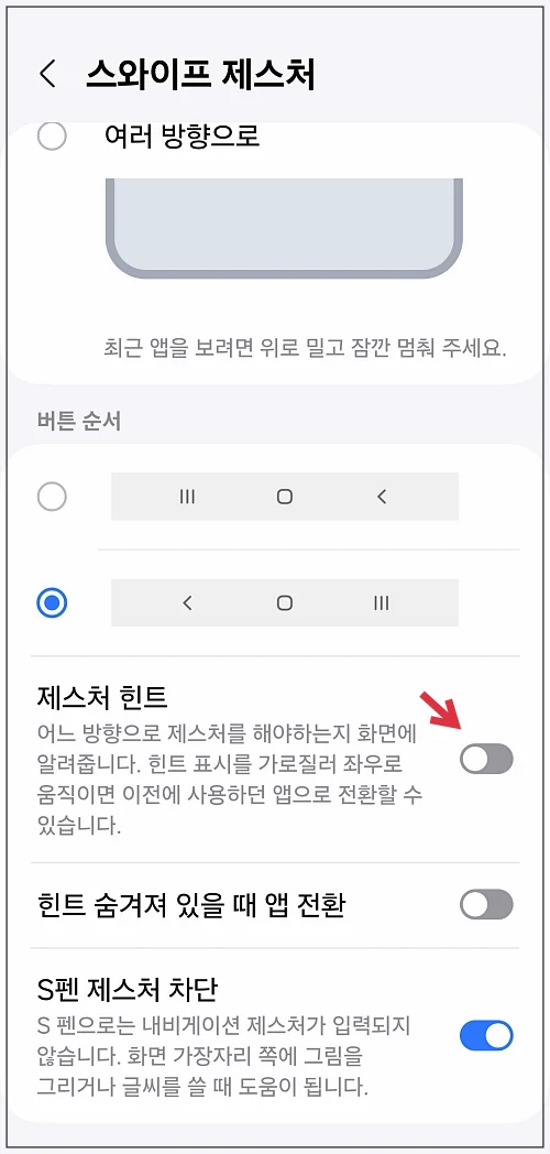 만약 저처럼 사용한다면 비활성화 시키고 그게 아닌 제스처 힌트가 보여지길 원한다면 활성화 시키시면 됩니다.