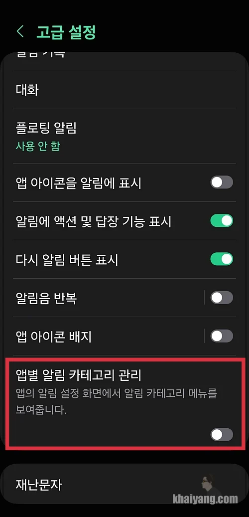 다시 앱 알림 항목에 들어가보면 하단에 알림 카테고리 메뉴가 보이는 것을 알 수 있습니다.