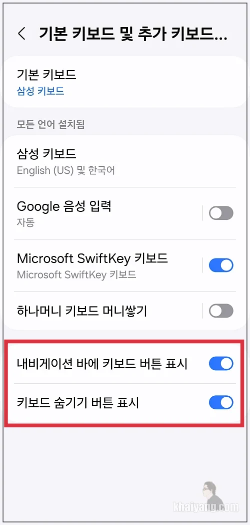 맨 하단에서 키보드 하단의 공간을 제거하고 싶다면 이 두 부분을 모두 비활성화 시키시면 됩니다.