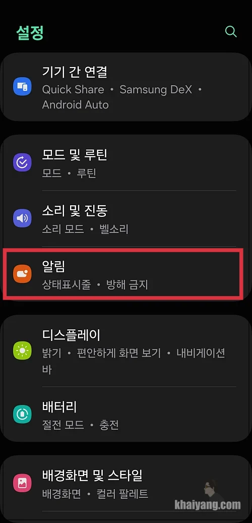 설정 메뉴에 들어가서 알림 항목을 선택 합니다.