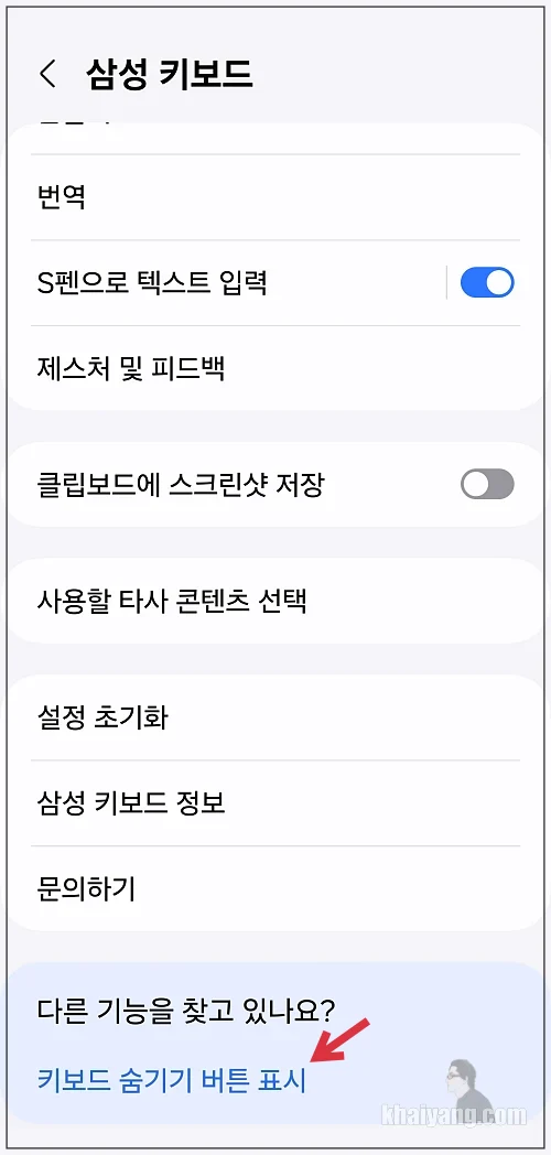 설정에 들어가서 삼성 키보드 항목에서 제일 아래로 내리면 키보드 숨기기 버튼 표시 항목이 있습니다.