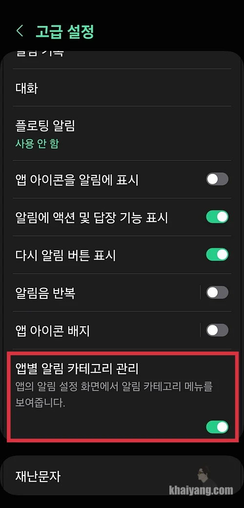 다시 앱 알림 항목에 들어가보면 하단에 알림 카테고리 메뉴가 보이는 것을 알 수 있습니다.
