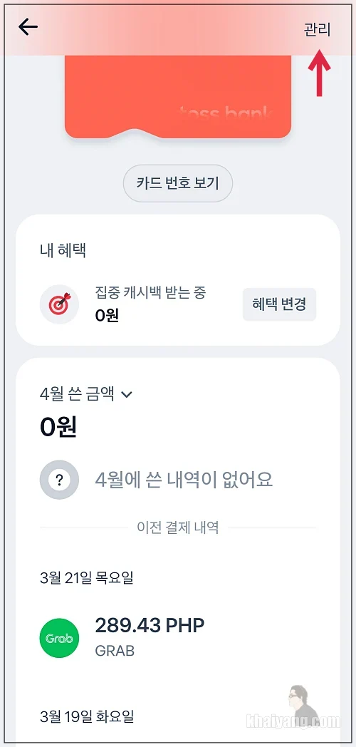 이 화면에서 상단 오른쪽에 있는 관리 메뉴를 선택 합니다. 카드 번호 보기도 이 화면에서 확인을 할 수 있습니다.