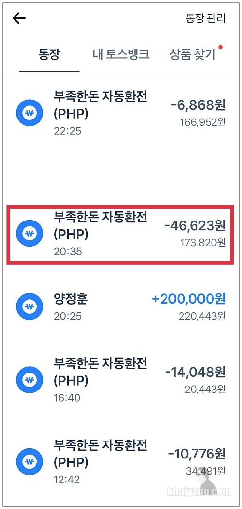 그럴때는 부족한 돈 자동환전 기능을 이용하면 편합니다. 저도 이번에 이 방식을 이용했는데 상당히 편하더군요.