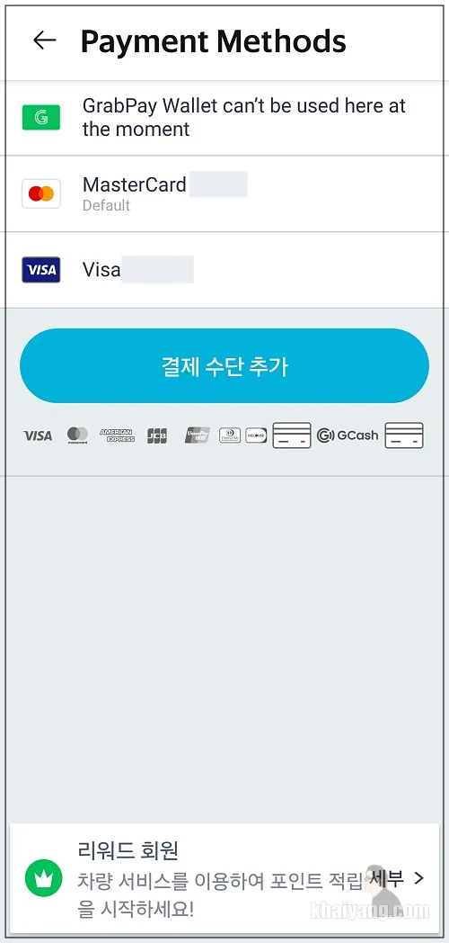 토스카드 등록하는 방법은 그랩에 들어가셔서 결제 수단 추가 항목에서 카드를 선택 하시면 됩니다.