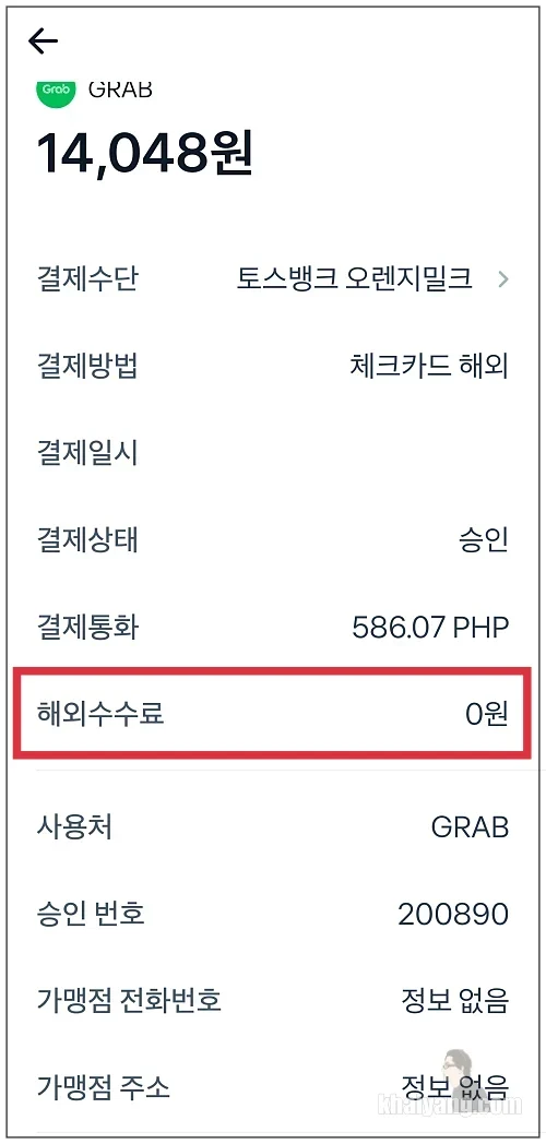 그랩에서 결제한 토스 금액을 보면 해외수수료 항목이 0원이라고 되어 있는 것을 볼 수 있습니다.