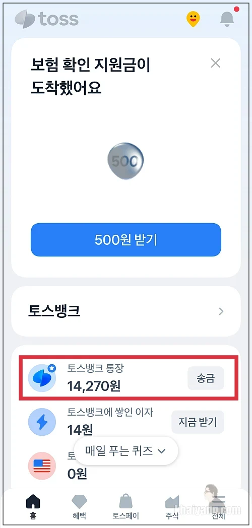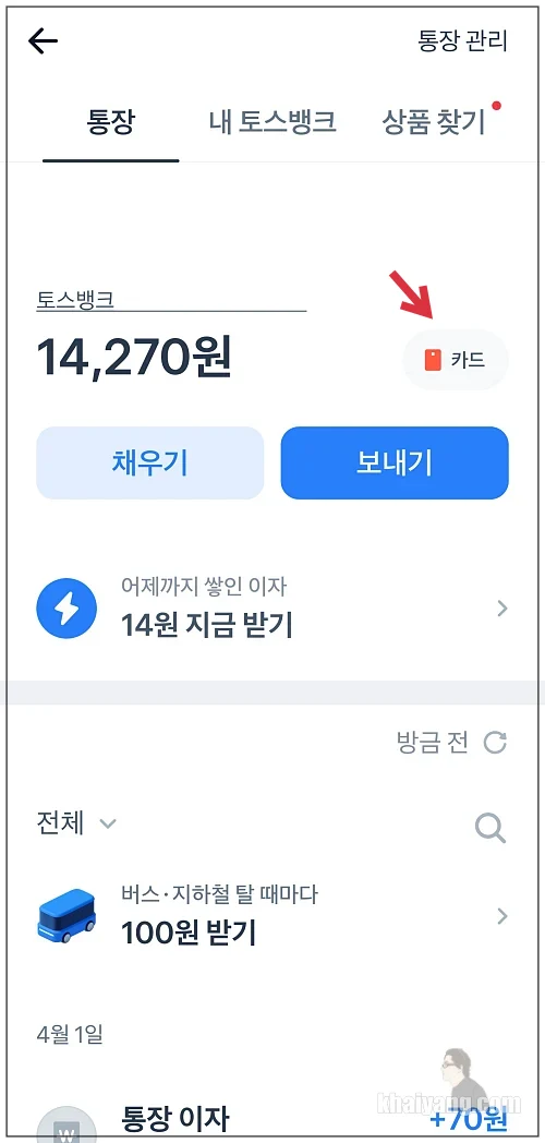 토스뱅크 앱을 열고 나서 메인 화면에 있는 토스뱅크 통장을 선택 합니다.