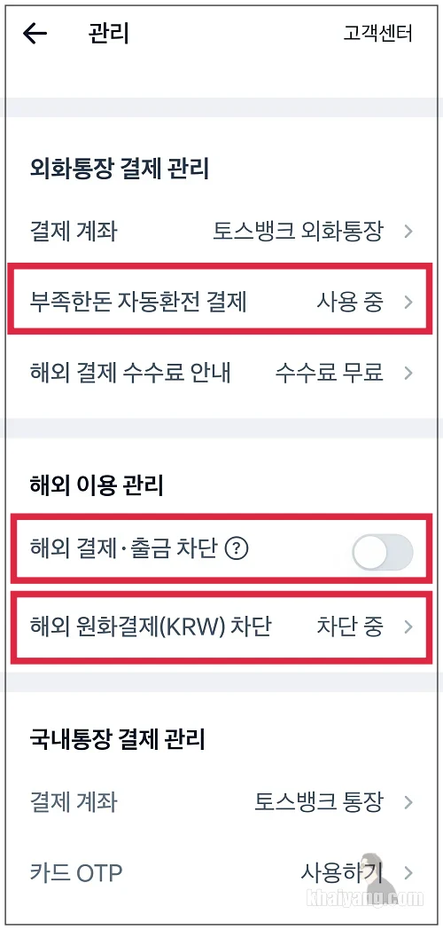 관리 항목에 주요 설정을 할 수 있는데요. 이곳에서 외환통장 결제 관리에서 부족한 돈 자동결제 항목을 사용 중으로 선택 하시면 됩니다. 만약 해외에서 사용할 계획이라고 하면 해외 결제 출금 차단을 비활성화 시켜 놓으셔야 합니다.