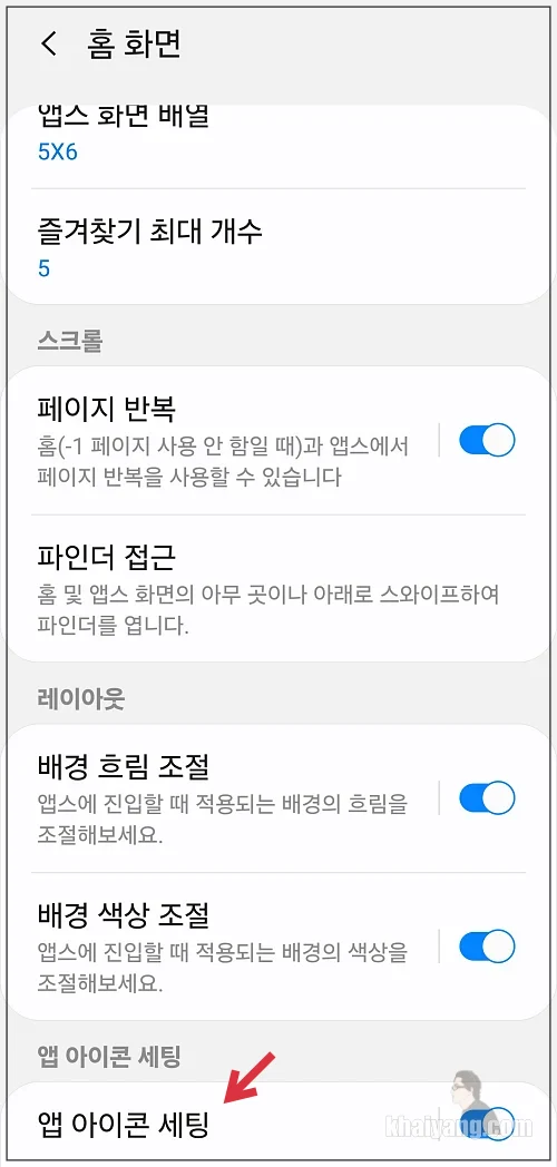 앱 아이콘 크기를 변경하려면 여기에서 제일 하단에 있는 앱 아이콘 세팅을 활성화 시킵니다.