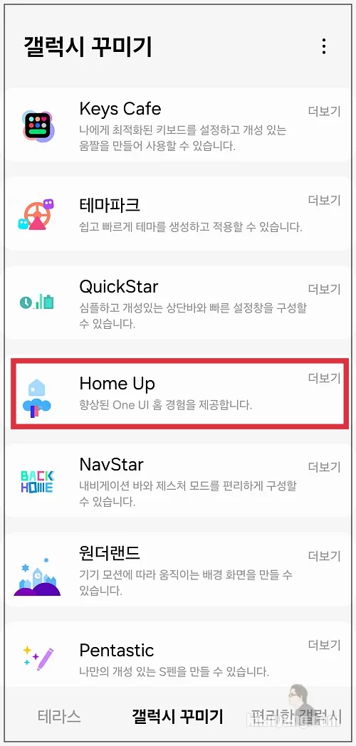 굿락 앱을 열어서 여기에서 갤럭시 꾸미기 화면으로 이동한 후에 홈 업(Home Up) 항목을 실행 합니다. 만약 설치가 안되어 있다면 설치하고 아직 업데이트를 안 하신 분들은 최신 버전으로 업데이트를 하면 됩니다.