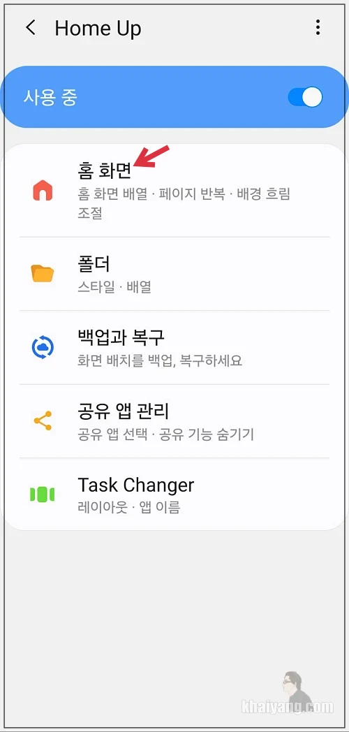 홈 업에 들어가셔서 상단에 있는 홈 화면 항목을 선택 합니다.