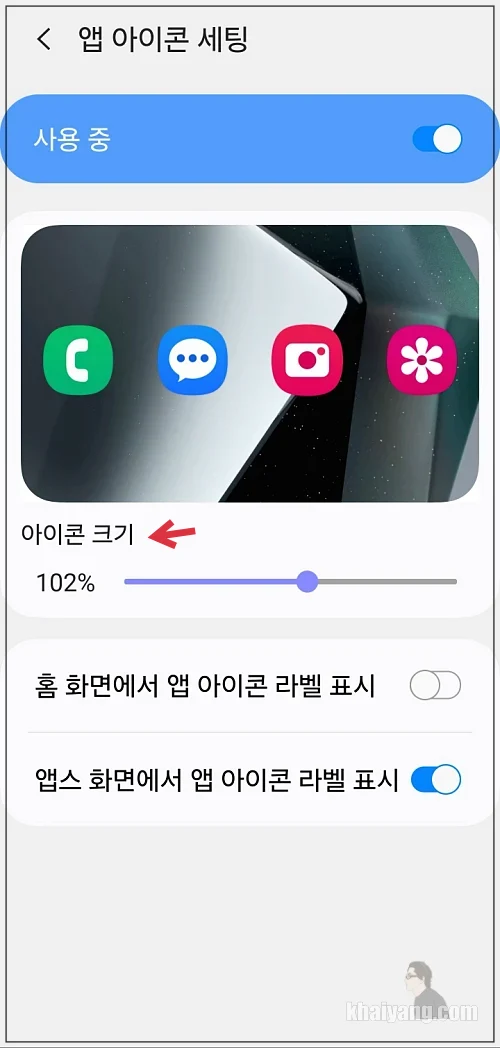 앱 아이콘 크기를 변경하려면 여기에서 제일 하단에 있는 앱 아이콘 세팅을 활성화 시킵니다.