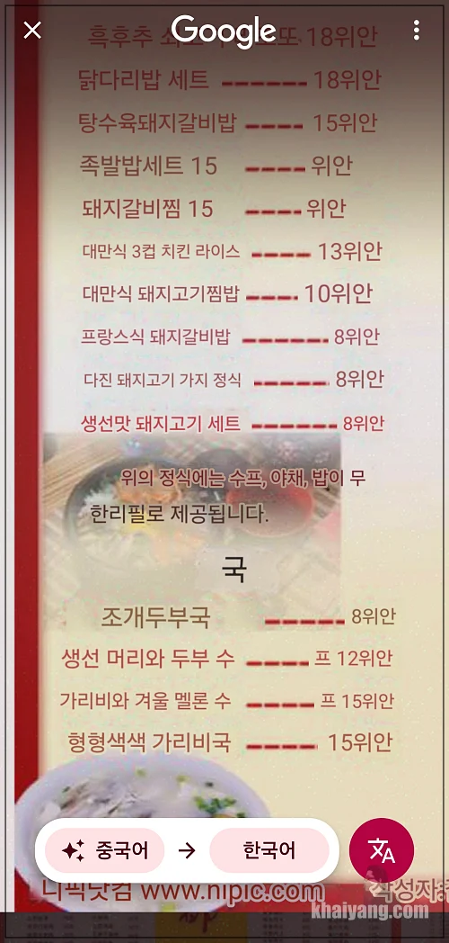중국어 메뉴판도 번개같이 번역해 줍니다.