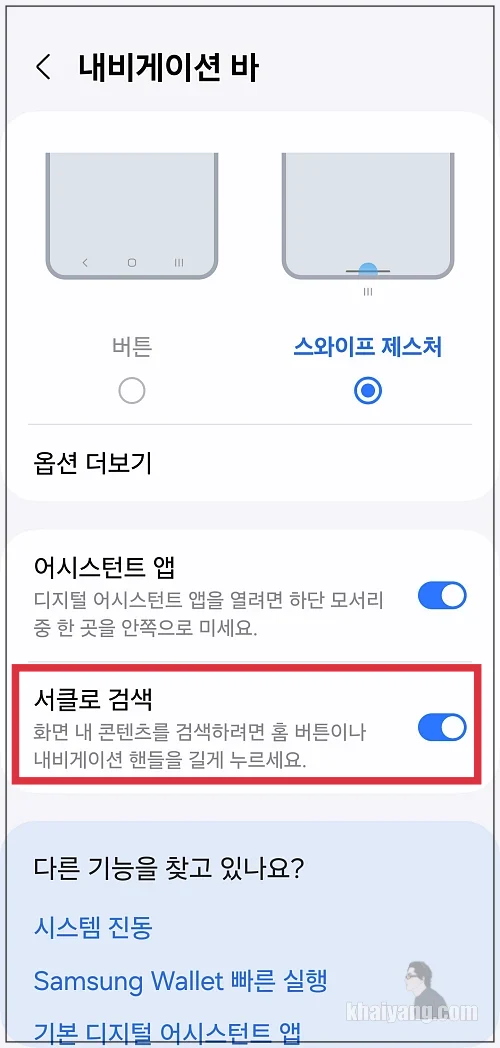 만약 하단에 있는 홈 버튼 위치를 꾹 눌렀을때 서클투써치 기능이 활성화 되지 않는다면 기능을 활성화 시켜야 합니다.