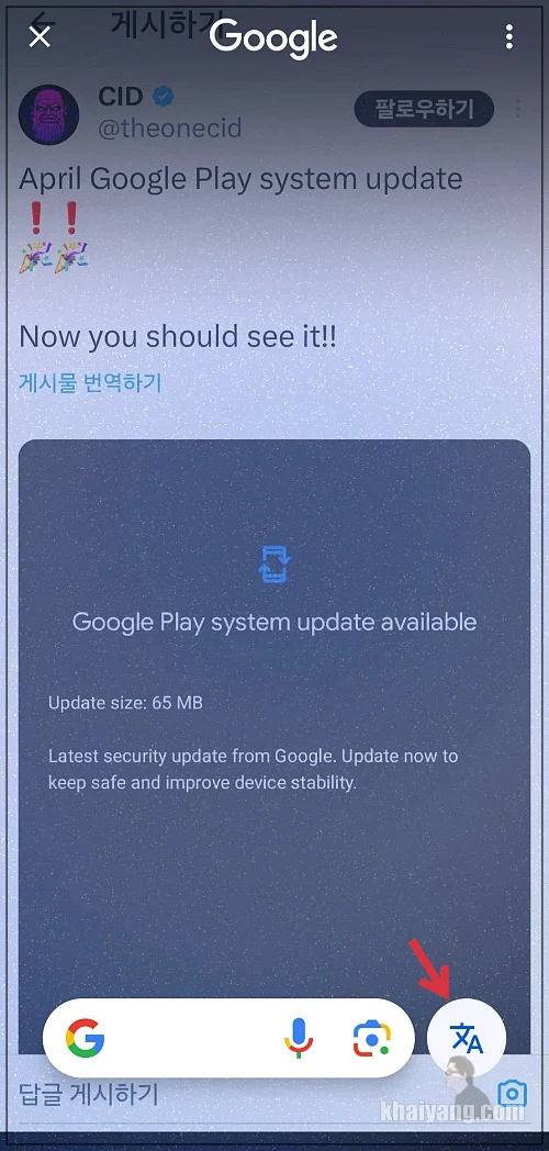 하단 가운데를 꾹 누르고 서클투서치가 나오면 하단 부분에 기존에 없었던 번역 버튼이 추가된걸 볼 수 있습니다. 여기를 누르면 바로 화면이 번역이 됩니다.