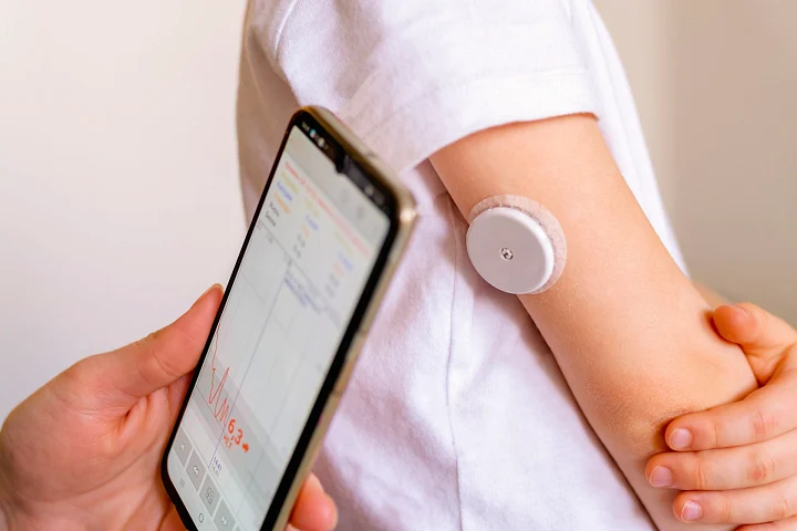 연속혈당측정기(CGM)는 사용자의 팔에 부착하면 자동으로 혈당을 측정하고 스마트폰에 접촉을 해서 바로 바로 혈당을 모니터링할 수 있습니다.