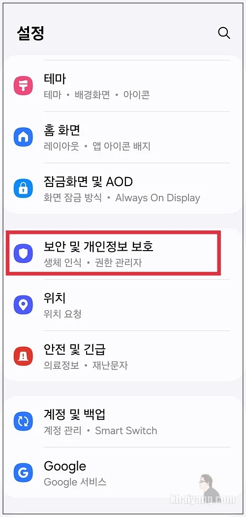 설정에서 보안 및 개인정보 보호 항목을 선택 합니다.