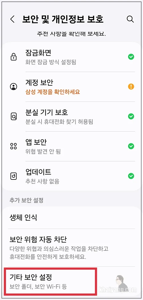 보안 및 개인정보 보호 항목에 들어가서 밑으로 내려보면 하단에 기타 보안 설정이 있습니다.