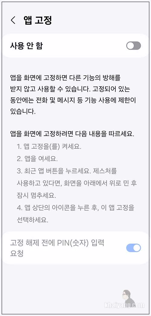 앱 고정 항목으로 들어가면 사용 안 함으로 되어 있는데 사용 함 으로 설정 합니다. 그리고 하단에 보이는 고정 해제 전에 PIN(숫자) 입력 요청 항목도 활성화 시켜줍니다.