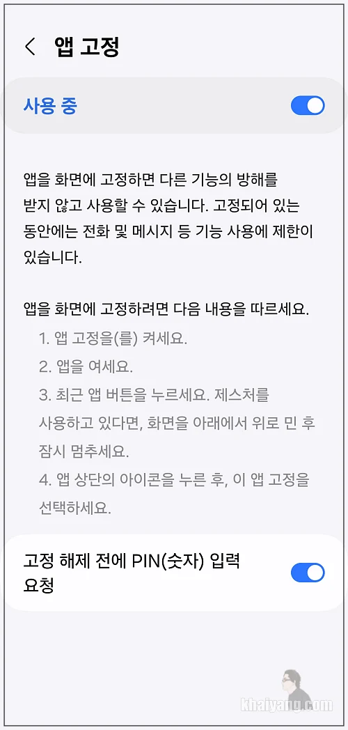 이 부분을 선택 해야 상대방이 앱 고정을 마음대로 풀지 못합니다.