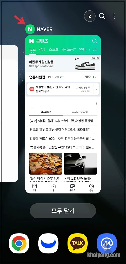 예를 들어 네이버 앱을 실행 했습니다. 그 다음에는 최근 앱 버튼을 누릅니다. 저는 하단에 최근 앱 버튼이 없는데 하단에 작대기 3개 있는 걸 누르면 될 겁니다.