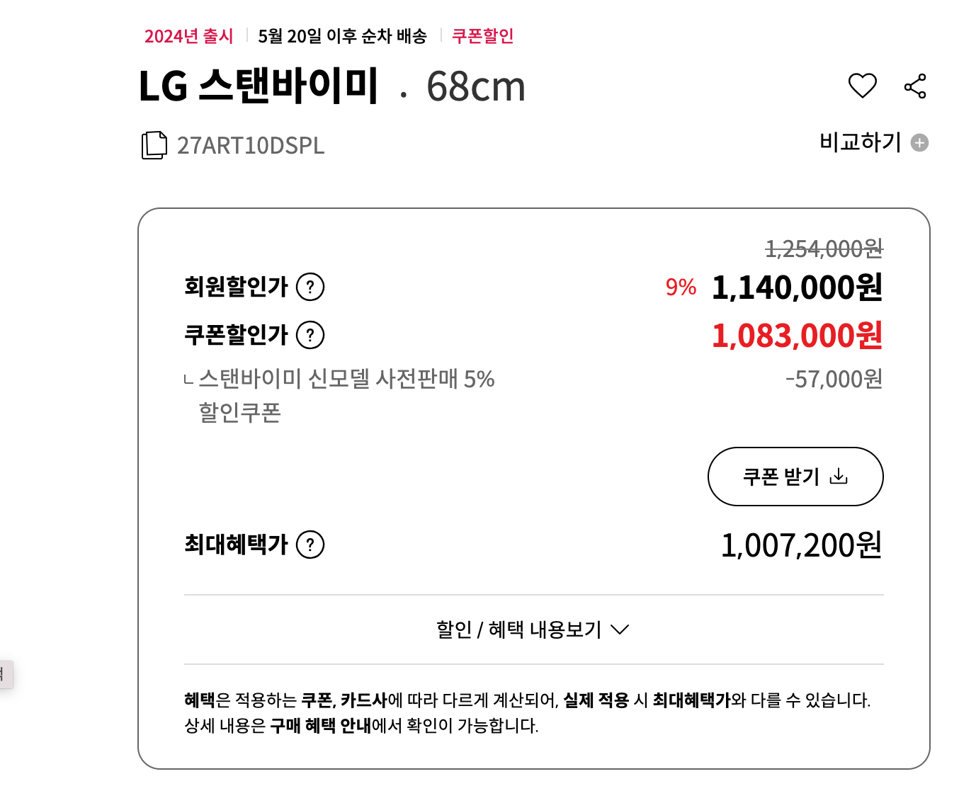 현재 LG전자 홈페이지에서 사전예약으로 판매가 진행 중인데 오늘 설명 드린 풀옵션 스탠바이미 가격은 회원 할인가 + 사전판매 쿠폰할인가를 적용해서 107만원 정도 합니다.