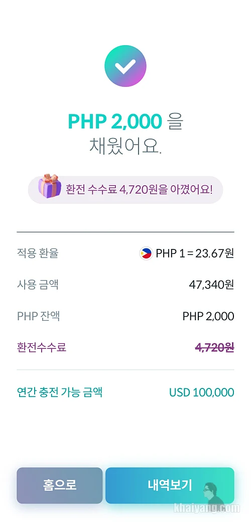 2천페소 채우고 내역을 보면 환전수수료 4720원을 아낀 걸 볼 수 있습니다.