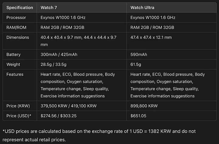 울트라 AP는 워치7 시리즈와 동일한 3나노 공정의 엑시노스 W1000 이 들어갈 예정입니다. 램은 2GB 저장공간은 기존보다 2배로 늘어난 32GB 입니다.