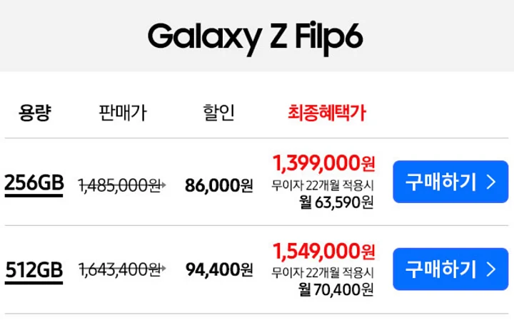 갤럭시Z플립6 512GB 같은 경우 1,549,000원에 구매를 할 수 있는데, 삼성닷컴 1,549,090원과 역시나 거의 동일한 금액대에 구매할 수 있습니다.