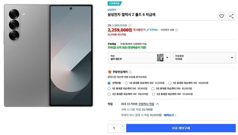 쿠팡에서 갤럭시Z폴드6 구매 비용은 어떻게 될까요?