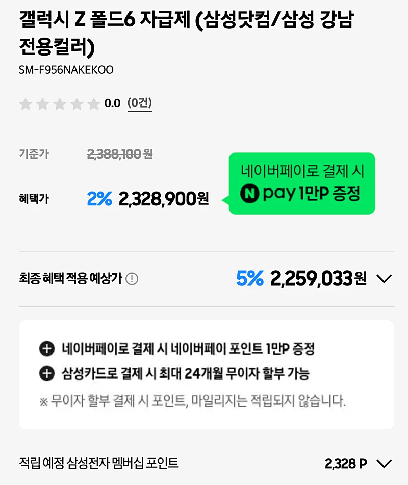 갤럭시Z폴드6 512GB 최종 금액을 보면 기본 2% 할인에 삼성카드 3% 추가 할인을 받는 경우 총 5% 할인으로 2,259,033원 입니다.