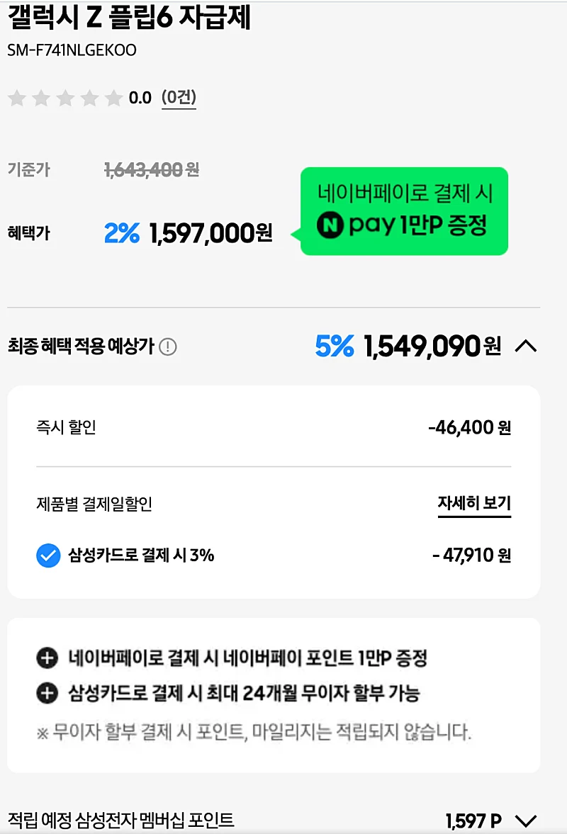 만약 삼성 베네핏 카드가 있다면 이 금액에서 추가 3% 할인을 받을 수 있습니다.